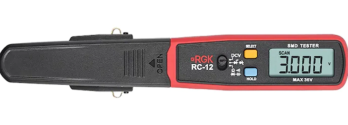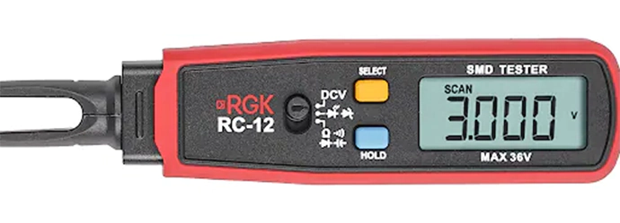 Измеритель smd-компонентов RGK RC-12 предназначен для измерения напряжения постоянного тока до 36 В, определения сопротивления, емкости и характеристик диодов, проверки проводимости, тестирования полупроводников, конденсаторов, резисторов и прочих электронных компонентов печатной платы. Широко используется при ремонте и диагностике электронных устройств. Прибор работает от двух батареей типа ААА 1,5 В.