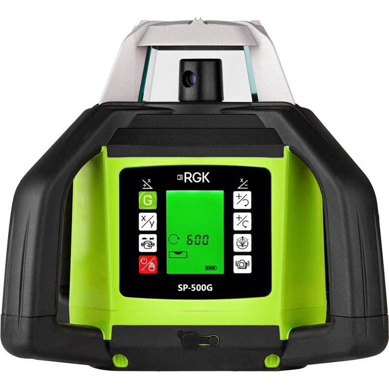 Наличие пульта ДУ позволяет управлять прибором на расстоянии — включать/выключать лазер, переключать режимы и регулировать скорость вращения излучателя. Благодаря яркому зеленому лучу оператор четко видит лазерную линию на улице в солнечную погоду, что снижает утомляемость глаз и повышает скорость работы. Прочный корпус и защита от пыли и влаги обеспечивают стабильную работу нивелира RGK SP-500G в тяжелых условиях стройплощадки.