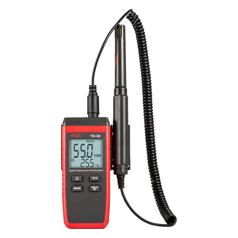 Цифровой термогигрометр RGK TH-30 c поверкой предназначен для измерения температуры от - 10 до + 60 °C, а также влажности от 10 до 95 %. Датчик расположен на гибком спиральном проводе, который позволяет проверять климатические параметры в вентиляционных каналах. Поставляется с батарейками в комплекте, поэтому их не придется докупать.